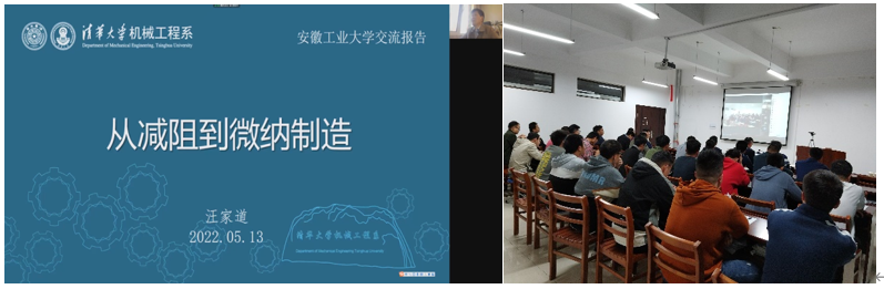 5月13日上午,应机械工程学院邀请,我校杰出校友、清华大学机械工程学院副院长汪家道教授通过线上方式为我校师生作了题为《从减阻到微纳制造》的精彩学术报告,报告会由院长刘庆运主持,副院长李克明、饶思贤以及机械学院师生350余人参加报告会,校长魏先文全程出席了报告会。