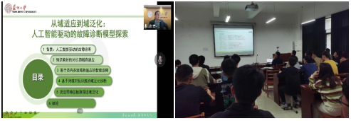 沈教授从机械设备关键部件故障诊断的现实意义入手,介绍了人工智能驱动故障诊断的重要性。针对传统深度学习方法在缺少数据源条件下难以完成有效诊断的问题,引出了开展基于深度迁移学习的故障诊断方法研究的必要性。沈教授结合团队近年来在深度学习领域所取得的成果,分享了基于知识映射的对抗领域自适应方法、基于类内多源自适应故障诊断方法、基于跨域对抗训练的域泛化诊断方法等一系列高水平创新性成果。